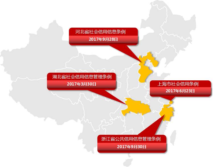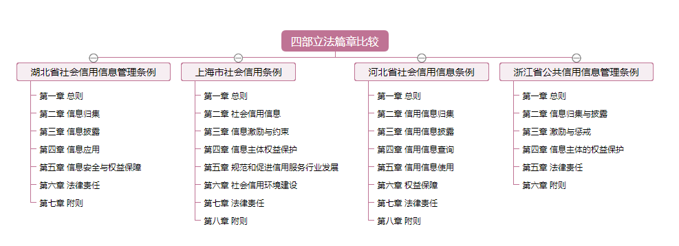 湖北设置了信息归集、信息披露、信息应用、信息安全与权益保障四章,上海设立了社会信用信息、信息激励与约束、信息主体权益保护、规范和促进信用服务行业发展、社会信用环境建设等五章,河北设立了信用信息归