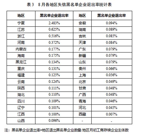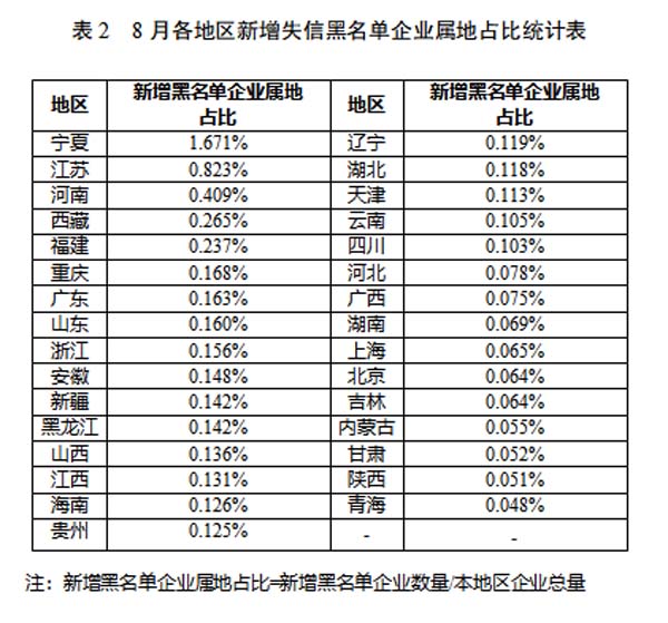 本月更新的重点领域失信黑名单包括失信被执行人、工商吊销企业、海关失信企业、重大税收违法案件当事人、安全生产黑名单、统计上严重失信企业、涉金融严重失信人等(见表1)。从数量上看,新增失信黑名单仍主要集中在失信被执行人和工商吊销企业。与7月份相比,工商吊销企业增量环比降幅最为明显,下降58.55%;失信被执行人、海关失信企业的月增量分别环比上涨30.76%和11.11%。从地区分布看,全国多数地区新增失信黑名单企业绝对数量较上月有不同程度下降,但江苏新增失信黑名单企业数量增长幅度较大,宁夏已连续四个月为全国各省份中新增失信黑名单企业属地占比最高的地区,江苏是失信黑名单退出数量最多的地区。