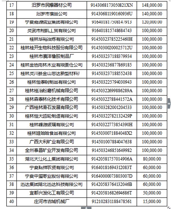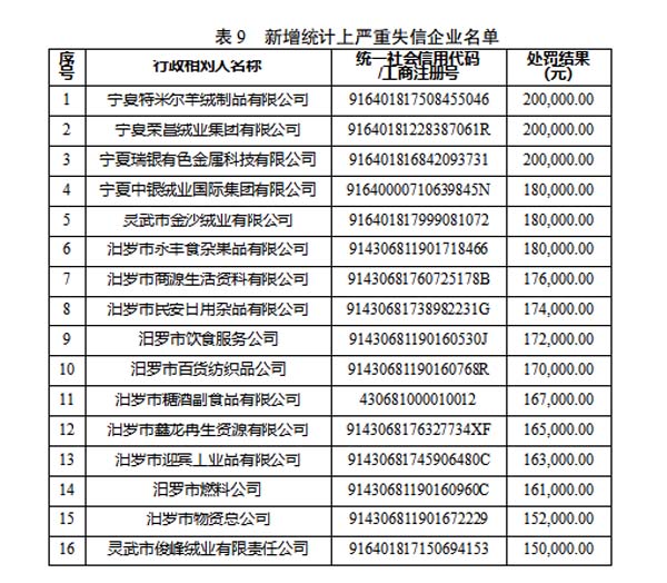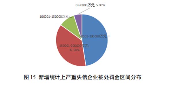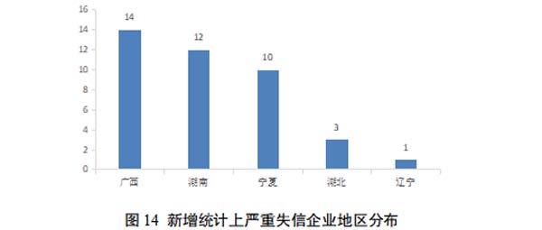 统计上严重失信企业:本月新增统计上严重失信企业40家,退出1家。从地区分布看,90%集中在广西、湖南、宁夏三省份(见图14)。处罚事由均为企业提供不真实统计资料,违法数额占应报数额比例较高,违法数额较大,相关监管机关给予企业警告、罚款并通报的处罚决定。处罚金额区间主要集中在5万至10万元,占比47.50%,其中罚金最高的达20万元,主要涉及3家宁夏地区企业(见图15、表9)。