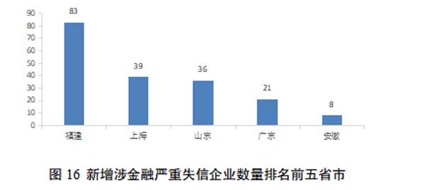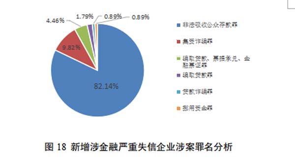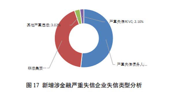 涉金融严重失信人:本月新增涉金融严重失信人399家,其中法人及其他组织231家,自然人168人。从地区分布看,涉金融失信企业主要集中在福建、上海、山东、广东、安徽五省份,其中福建数量最多,达到83家,占全国总数的35.78%(见图16);从失信类型看,主要集中在严重失信债务人方面,占比达到51.72%,其次是非法集资,占比43.10%(见图17);从涉案罪名看,近82%的涉金融失信企业构成非法吸收公众存款罪(见图18)。