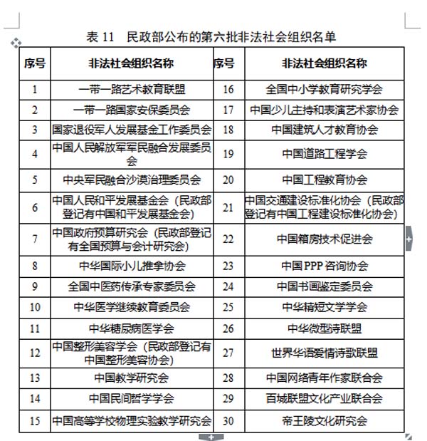 近日,民政部社会组织管理局公布了第六批涉嫌非法社会组织名单,共30家组织单位(见表11)。从冠名上看,非法社会组织往往冠以“中国”“中华”“全国”“世界”“联合国”等“高大上”的名头。从业务范围上看,非法社会组织善于“蹭热点”、打“擦边球”,往往跟风国家战略,使用“一带一路”“军民融合”“精准扶贫”“乡村振兴”等社会公众关心的热词。从组织形式上看,有的以“协会”“促进会”“联合会”“基金会”等传统社会组织的组织形式活动;有的以“委员会”“发展局”“中心”等类似政府机关和事业单位的组织形式活动;还有的以“联盟”“合作组织”等新型组织形式活动。