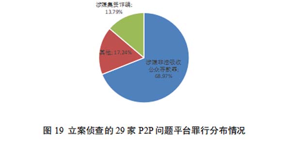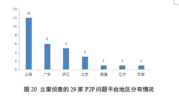 近两月来,有29家P2P问题平台被立案侦查。从地区分布看,上海涉案主体数量最多,占比达41.38%,其次是广东、浙江两地,分别占20.69%和17.24%。从案情看,以“涉嫌非法吸收公众存款”罪名立案最多,占比高达68.97%;此外,“涉嫌集资诈骗”占13.79%,全部集中在北上广地区(见图19、20、表10)。