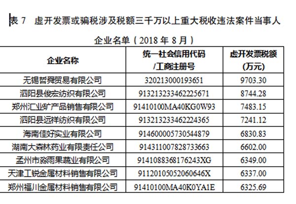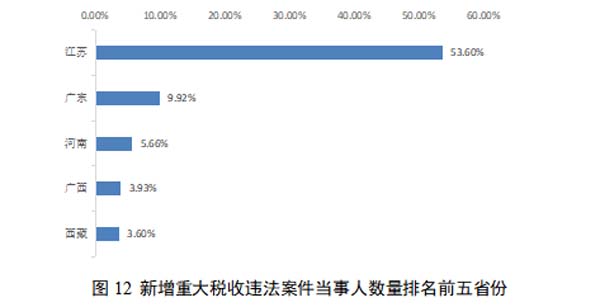 重大税收违法案件当事人:本月新增重大税收违法案件当事人1507家,其中法人及其他组织1502家,自然人5人。从地区分布看,本月新增重大税收违法案件当事人数量排名前五的省份为江苏、广东、河南、广西、西藏。其中,江苏新增重大税收违法案件当事人数量最多,占比高达53.60%(见图12)。从违法行为看,偷税且涉及税额三千万以上的有8家(见表6),虚开发票或骗税涉及税额三千万以上的有37家(见表7)。