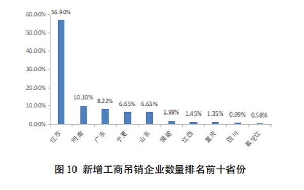 工商吊销企业:本月新增工商吊销企业38,353家,主要集中在江苏、河南、广东、宁夏、山东等地区,其中江苏占比高达56.90%(见图10)。