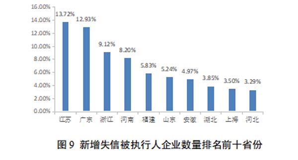从地区分布看,本月新增失信黑名单企业数量排名前五的省份为江苏、广东、河南、山东、浙江。全国多数地区新增失信黑名单企业绝对数量较上月有不同程度下降,但江苏新增失信企业增长幅度较大,增长近60%(见图3)。