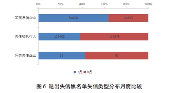 从失信黑名单类型来看,本月工商吊销企业退出数量降幅明显,环比下降42.98%;失信被执行人及海关失信企业退出数量有所增加,分别上涨61.69%和36.36%(见图6)。