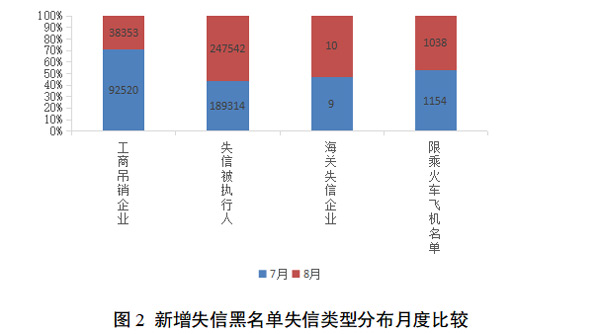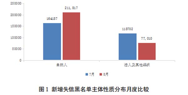 从失信黑名单主体性质看,本月新增失信自然人 211,817人,占新增失信主体总量的73.34%,新增失信法人及其他组织77,010家,占新增失信主体总量的26.66%。与7月相比,新增失信自然人数量上涨29.01%,而新增失信法人及其他组织下降35.12%(见图1)。