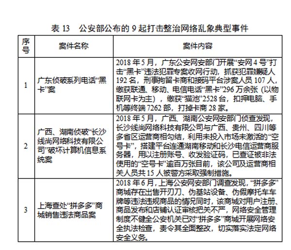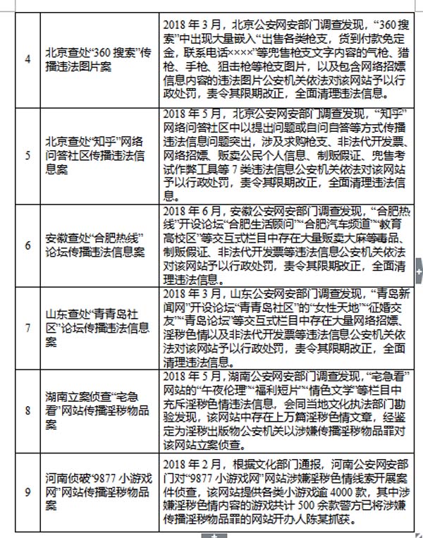 公安部部署开展打击整治网络违法犯罪“净网2018”专项行动以来,各地公安机关查处了一批网络违法犯罪案件。本月,公安部公布9起打击整治网络乱象典型事件,其中不乏知乎、拼多多、360搜索等知名互联网平台,其违法事实主要包括销售违法商品、传播违法信息、传播淫秽物品等。例如,2018年5月,北京市公安网安部门调查发现,“知乎”网络问答社区中以提出问题或自问自答等方式传播违法信息问题突出,涉及求购枪支、非法代开发票、网络招嫖、贩卖公民个人信息、制贩假证、兜售考试作弊工具等7类违法信息(见表13)。