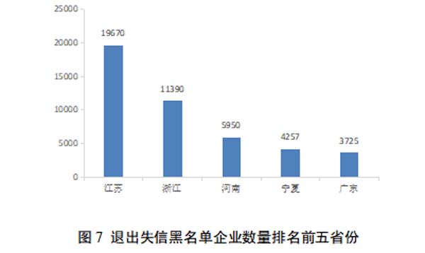 从地区分布看,本月退出失信黑名单企业绝对数量排名前五的省份为江苏、浙江、河南、宁夏、广东。其中,江苏退出黑名单企业19,670家,浙江退出黑名单企业11,390家(见图7)。