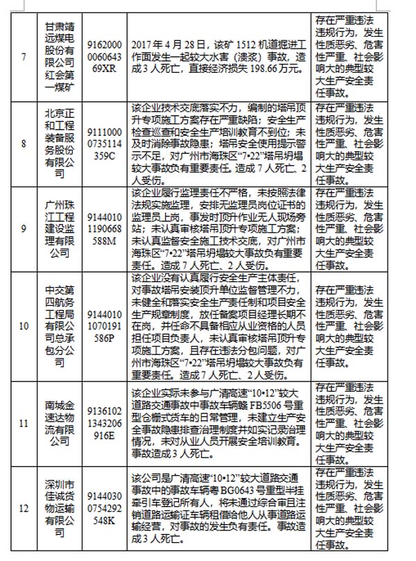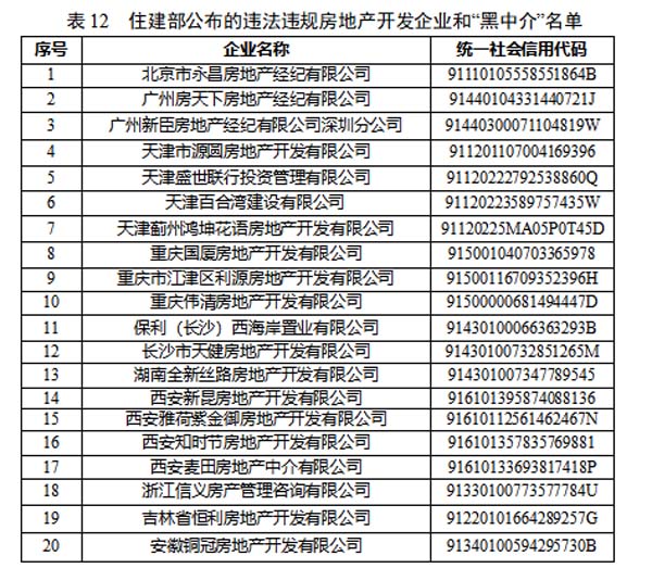 2018年7月31日,根据七部委联合发布《关于在部分城市先行开展打击侵害群众利益违法违规行为治理房地产市场乱象专项行动的通知》(建房〔2018〕58号),住房城乡建设部公布了一批各地查处的违法违规房地产开发企业和中介机构名单,共涉及20家企业,主要存在哄抬房价、“黑中介”、捂盘惜售、未批先售、虚假宣传等违法违规行为。其行为严重扰乱了房地产市场秩序,侵害了人民群众合法权益,造成了不良的社会影响(见表12)。