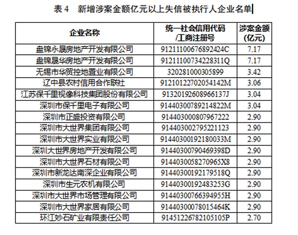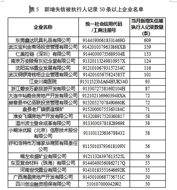 失信被执行人:本月新增失信被执行人信息295,476条,涉及失信主体247,542个,其中法人及其他组织36,931家,自然人210,611人。从地区分布看,本月新增失信被执行人企业数量排名前五的省份为江苏、广东、浙江、河南、福建(见图9)。从涉案金额看,78家企业涉案金额在1亿元以上(见表4)。从新增失信被执行人记录数量来看,新增失信被执行人记录3条以上的企业数量为2791家,其中20家企业新增记录超过50条,单个企业新增记录最高达609条(见表5)。