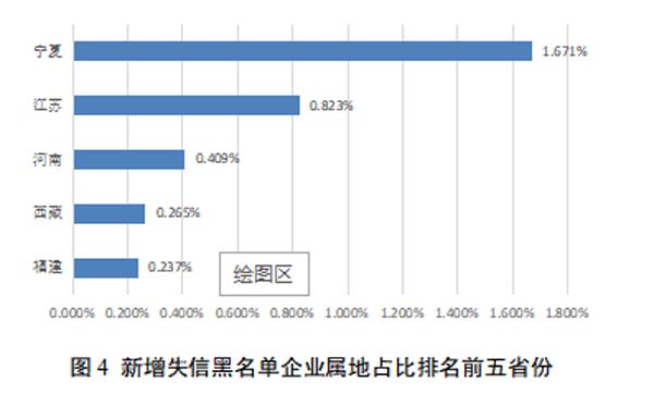从新增失信黑名单企业属地占比来看,比例较高的省份为宁夏、江苏、河南、西藏、福建。其中,宁夏新增黑名单企业属地占比最高,达到1.671%,且已连续四个月为全国各省份中新增失信黑名单企业属地占比最高的地区(见图4)。新增失信黑名单企业属地占比最低的五省份为青海、陕西、甘肃、内蒙古、吉林,多为经济欠发达地区(见表2)。
