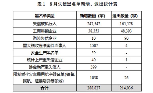 2018年8月,全国信用信息共享平台新增失信黑名单信息336,884条,涉及失信主体 288,827个,其中法人及其他组织77,010家,自然人 211,817人;8月份退出失信黑名单主体214,036个,其中法人及其他组织68,595家,自然人145,441人。