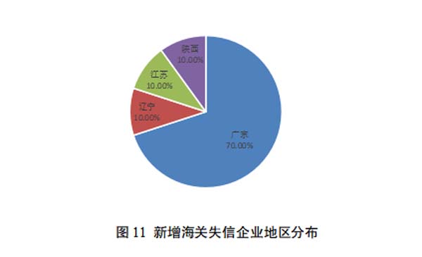 海关失信企业:本月新增海关失信企业10家,分布在广东、辽宁、江苏、陕西四省,其中广东7家,占比70%,其余三省各1家(见图11)。