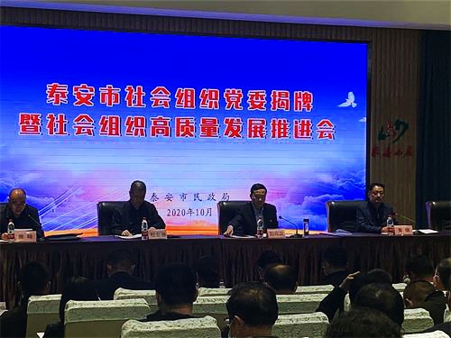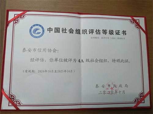 为进一步推进社会组织高质量发展,泰安市民政局于2020年10月23日召开泰安市社会组织党委揭牌暨社会组织高质量发展推进会。泰安市信用协会荣获泰安市民政局颁发的4A中国社会组织评估等级,被中共泰安市社会组织委员会评定为四星级党建示范点。