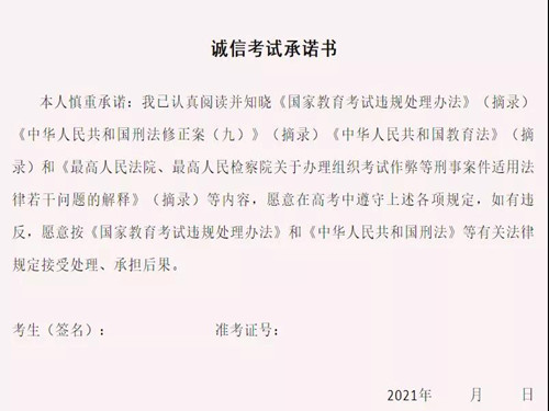 除了这份承诺书,各地也会在高考前的一段时间里开展“诚信考试诚实做人”主题班会、诚信教育讲座等诚信考试教育宣传活动,教育和引导广大考生自觉抵制违纪、舞弊等行为,培养诚实守信、遵纪守规意识,构建良好的考试秩序,营造公平、公正的考试环境。