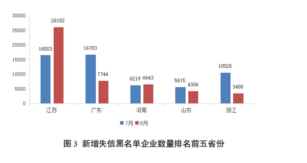 从地区分布看,本月新增失信黑名单企业数量排名前五的省份为江苏、广东、河南、山东、浙江。全国多数地区新增失信黑名单企业绝对数量较上月有不同程度下降,但江苏新增失信企业增长幅度较大,增长近60%(见图3)。