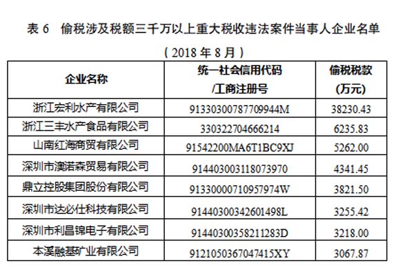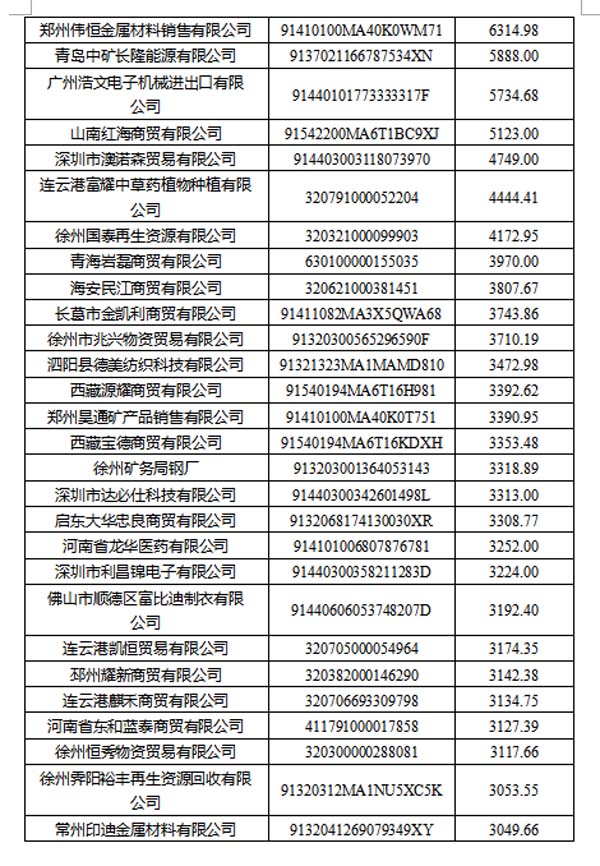 重大税收违法案件当事人:本月新增重大税收违法案件当事人1507家,其中法人及其他组织1502家,自然人5人。从地区分布看,本月新增重大税收违法案件当事人数量排名前五的省份为江苏、广东、河南、广西、西藏。其中,江苏新增重大税收违法案件当事人数量最多,占比高达53.60%(见图12)。从违法行为看,偷税且涉及税额三千万以上的有8家(见表6),虚开发票或骗税涉及税额三千万以上的有37家(见表7)。