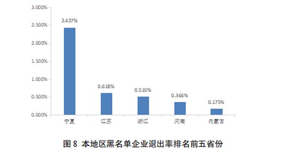 从本地区黑名单企业退出率来看,退出率较高的省份为宁夏、江苏、浙江、河南、内蒙古。在失信黑名单企业退出数量和本地区失信黑名单企业退出率两个指标上,江苏、宁夏、河南、浙江均位居全国前列(见图8)。