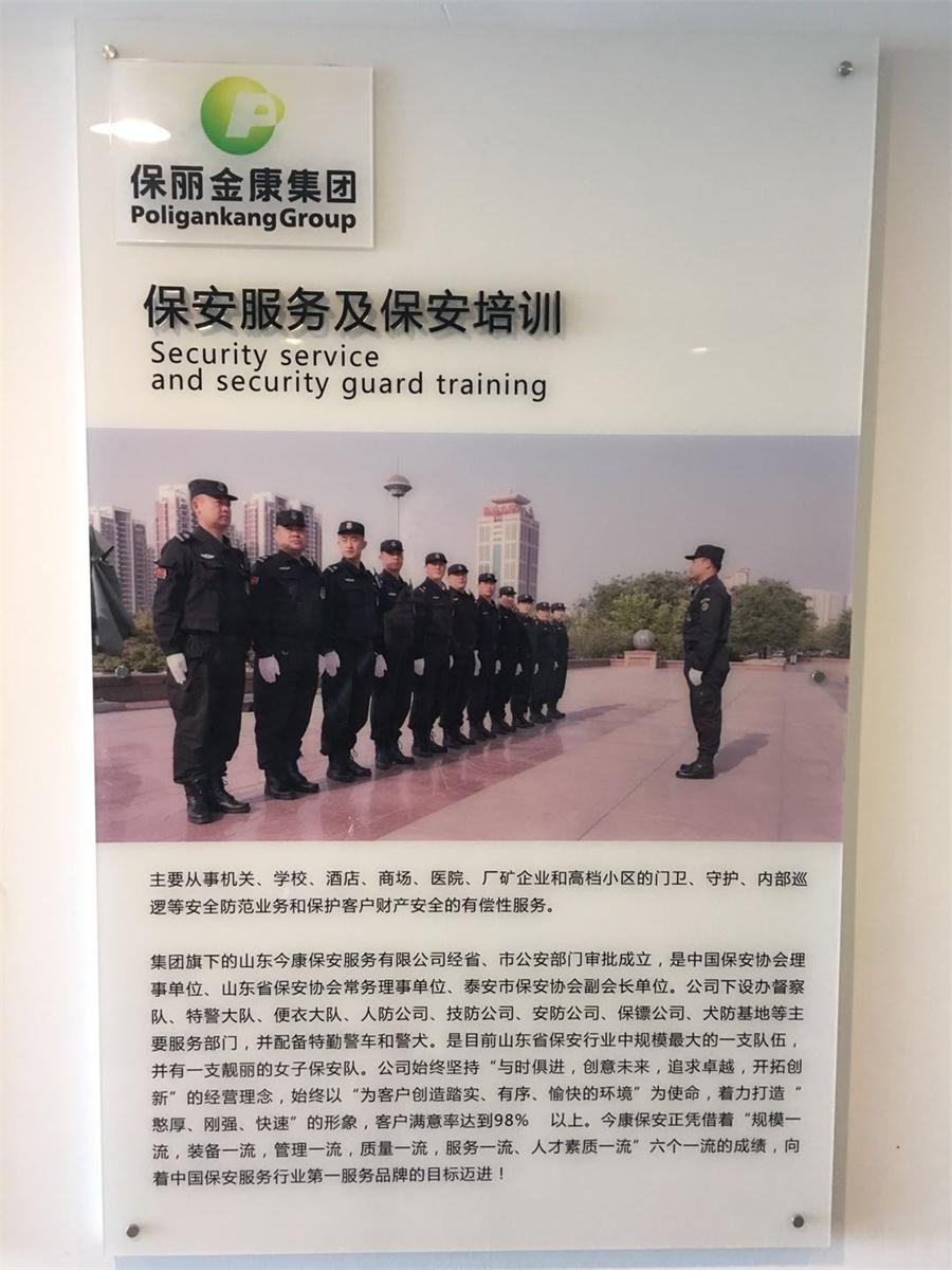 山东今康保安服务有限公司是经泰安市公安局,山东省公安厅正式批准、工商、税务 部门登记注册成立的,属于中国保安协会理事单位、山东省保安协会副会长单位。公司成立于1999年11月(前身:泰安市保丽洁物业管理有限公司安保部)2012年4月随着公司的不断壮大,项目不断增加,经省、市公安部门审批成立。公司下设办公室、培训部、财务部、人力资源部、督察队、特警大队、便衣大队、人防公司、技防公司、安防公司、保镖公司、犬防基地等主要部门,并配备特勤警车和警犬。